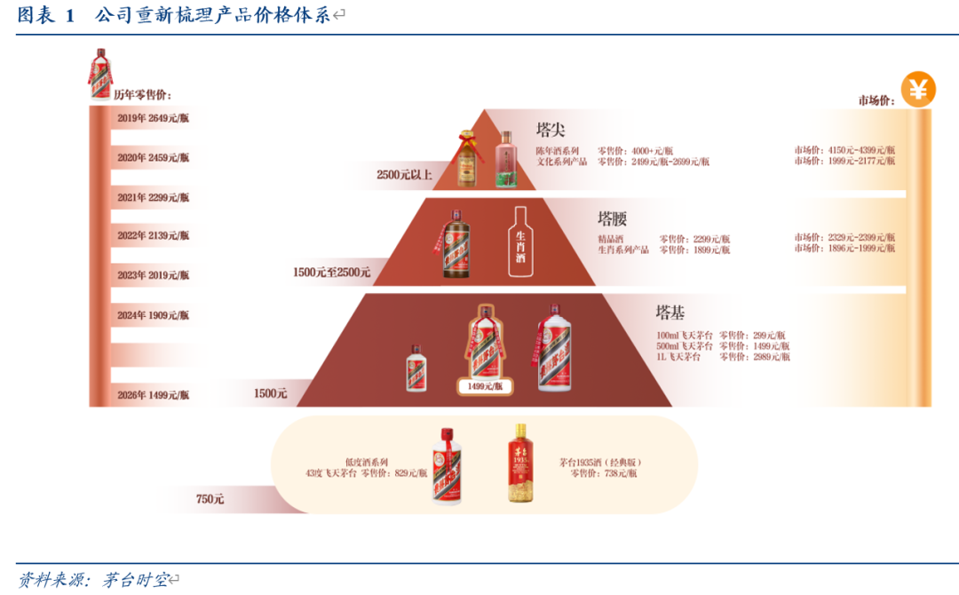 加速市场化转型:产品线更精简,发力链接C端,并维护渠道利益。公司定调2026全面推进茅台酒营销市场化转型,具体看:产品端围绕需求打造金字塔型产品体系,普茅随行就市坚实筑底,其余规格飞天缩减投放,塔腰精品(2000-2500元价格带)升级酒质,打造成第二大单品,生肖酒调整投放,强化收藏文化价值,塔尖陈年酒(4000元价格带)缩减供给维护稀缺性与品牌调性;渠道端构建“自售+经销+代售+寄售”的多元销售模式,自售、经销不断巩固优化,代售模式针对500ml普飞市场化运作,寄售针对生肖、公斤装、文化等产品,经销商收取手续费,获取利润;市场端科学测算区域容量优化投放效率,并取消高附加值产品分销政策,务实减轻渠道负担,不让经销商亏钱,并健全优胜劣汰制度。从产品、渠道和市场投放几方面看,切实体现公司以全面深化市场化改革破局的决心。