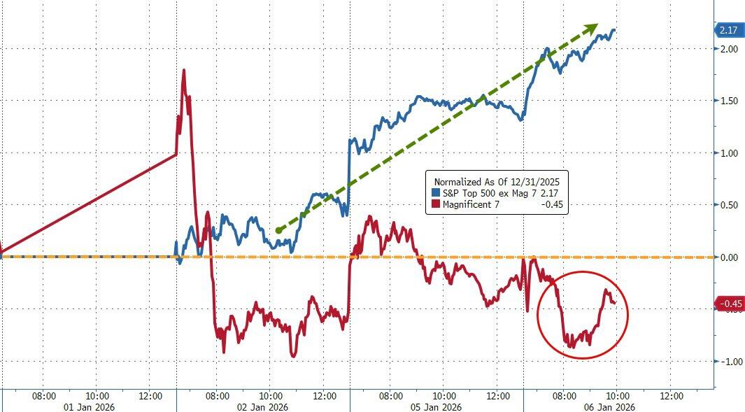 市场结构正在发生显著变化。进入2026年以来,包括英伟达、苹果、微软、谷歌母公司Alphabet、亚马逊、特斯拉和Meta在内的“科技七巨头”(Mag7)总体累跌约0.5%,而标普500指数中的其余493只成分股总体累涨2.5%。随着投资者开年重新配置资产,工业、医疗保健和科技板块年初三个交易日表现突出。