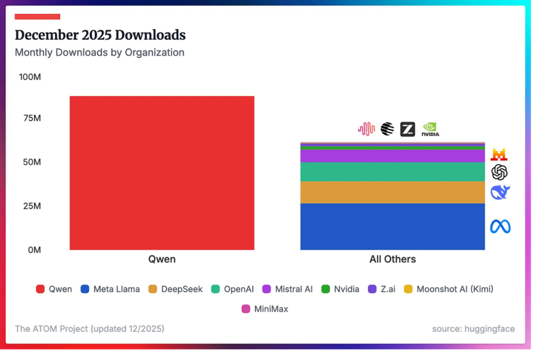 1月9日全球最大AI开源社区Hugging Face最新数据显示,阿里千问大模型下载量激增,在2025年12月下载量超Meta、DeepSeek等2-9名总和。目前,千问大模型累计下载量7亿,是当前全球开发者采用率最高的开源模型。
