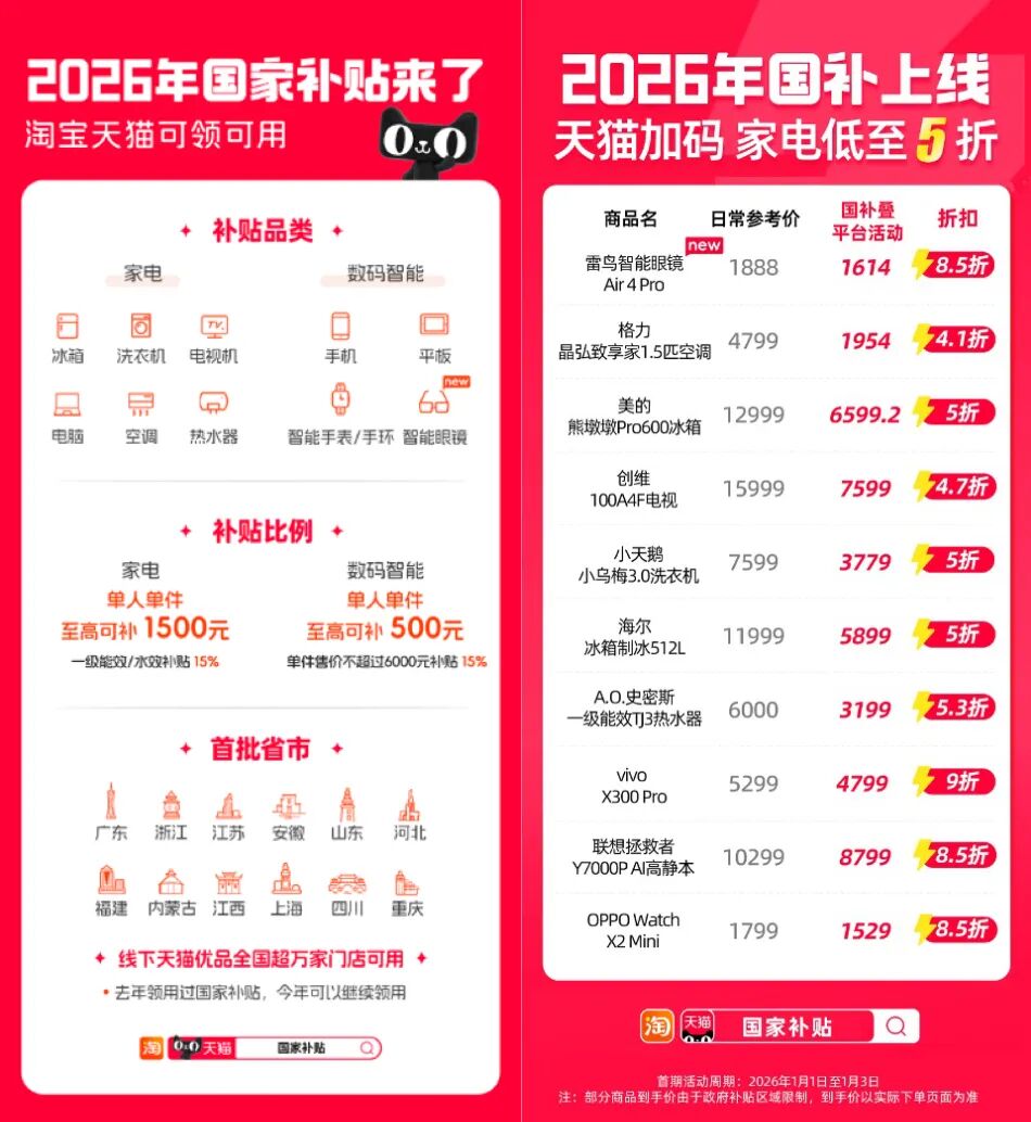 1月1日起,2026年国补上线淘宝天猫,覆盖冰箱、洗衣机、电视、空调、电脑、热水器、手机、平板、智能手表手环、智能眼镜10大品类,智能眼镜首次纳入补贴。叠年货节优惠,家电低至5折。浙江、广东、上海、北京等省市已率先上线,通过淘宝App首页“国补”频道或搜索“国家补贴”领用,天猫优品全国超万家门店同步支持领用。
