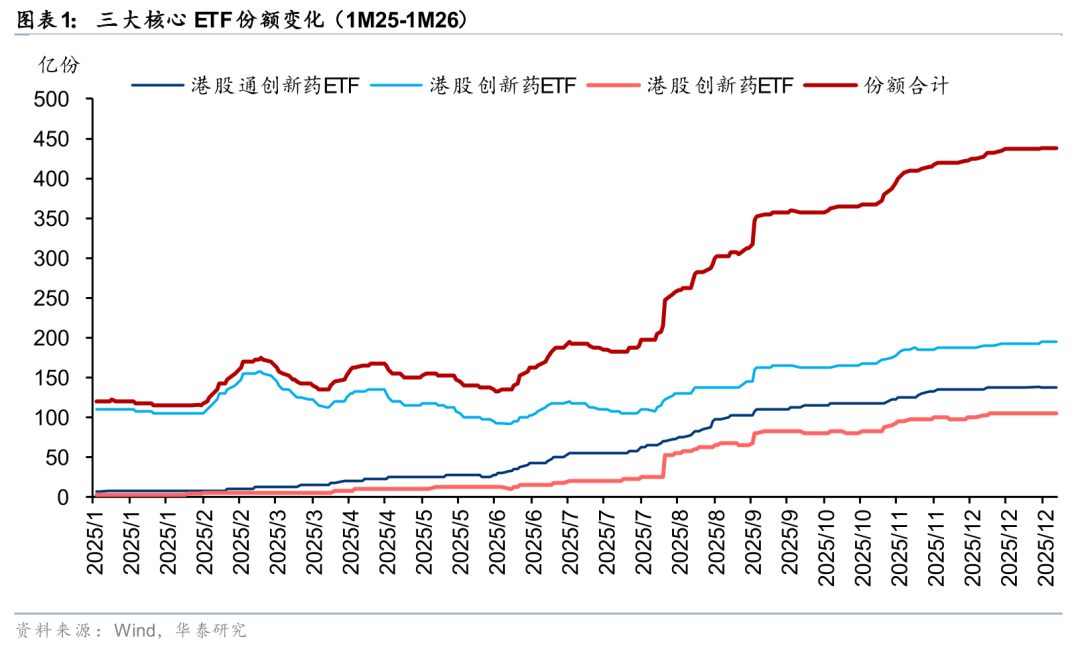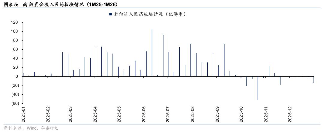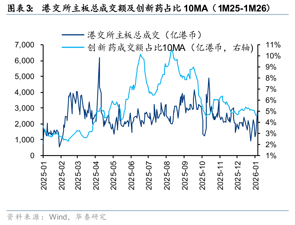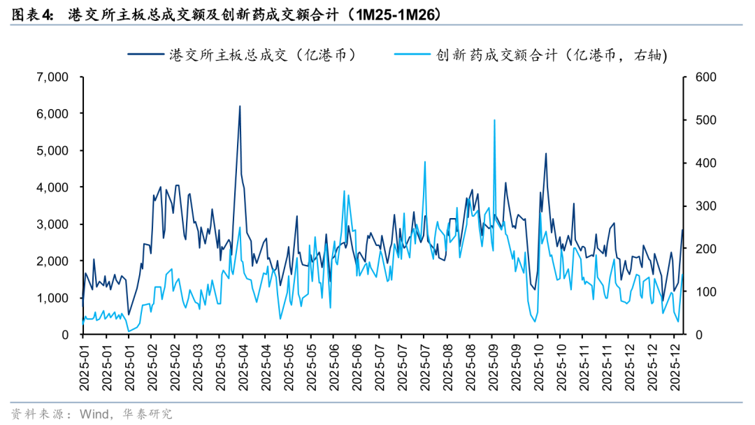 我们回顾了港股创新药2025年全年表现,得出以下结论:1)交易量在11、12月急速萎缩,日均交易量最低下降至50亿,回到2025年初水平(与2月相当),与最高点相比成交量下降90%,与高点均值相比下降接近80%;2)创新药交易量占港股主板成交量为~5%(11~12月),与高点10.5%相比萎缩近一半;3)南向资金在步入10月后,几乎没有净流入,呈现持续的净流出。我们认为11~12月的加速下跌更多的是体现了流动性折价,而非基本面。港股创新药板块交易金额从1月2日的30亿港币(占港交所主板总成交2%)恢复到1月7日的201亿港币(占港交所主板总成交7%),开年以来的流动性修复有望提振板块Beta。