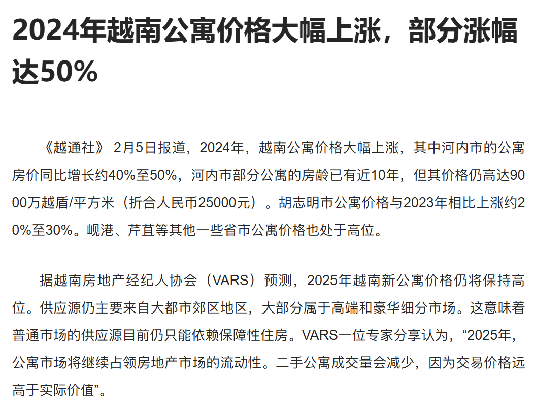 据越南建设部的数据,今年三季度,河内全市场平均初级销售价格约合人民币2.1万元/平方米,较2024年同期上涨33%;越南国家通讯社《越通社》披露,2024年,河内市的公寓房价同比增长约40%。
