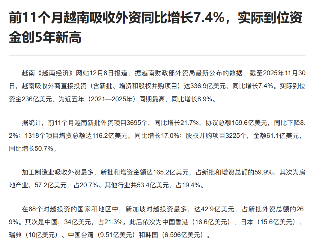 如今,越南似乎正复刻这一进程。据预计,2022—2025年期间,越南年度经济增长率达7.2%,还提出了2026年以后增长10%以上的目标;今年前11个月,越南实际到位外商直接资金总额约236亿美元,为五年来的最高水平。