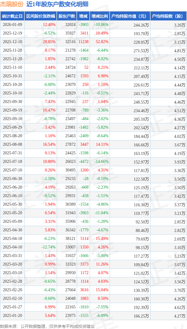 从股价来看,2025年12月19日至2026年1月9日,杰瑞股份区间涨幅为12.4%,在此期间股东户数减少3903.0户,减幅为10.86%。