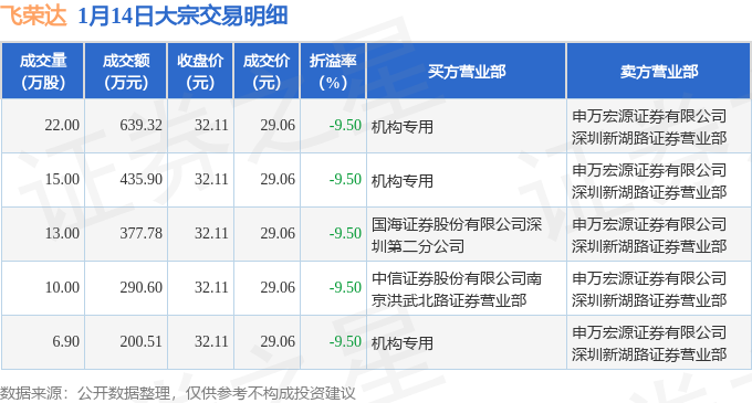 证券之星消息,1月14日飞荣达发生大宗交易,交易数据如下:
