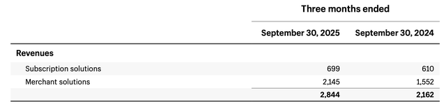 细分来看,该季度商家解决方案业务营收达 21.4 亿美元,占总营收的 75%;同比增速更是高达 38%,为公司 32% 的整体营收增速贡献了 28 个百分点 —— 几乎包揽了全部增长。