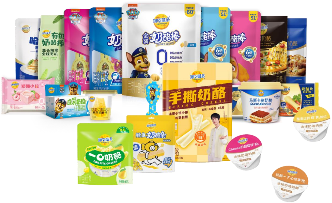 在C端,妙可蓝多与蒙牛形成差异化品牌矩阵:在稳固儿童奶酪棒大单品的同时,妙可蓝多的成人奶酪产品以高蛋白等配方,切入商超高端货架;而蒙牛则依托渠道下沉优势,以高性价常温奶酪棒产品打开社区及电商市场,双品牌精准覆盖不同消费场景。
