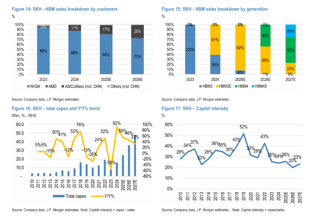 在技术路线上,摩根大通认为SK海力士将继续保持其市场份额和技术领先地位。尽管由于高基数效应和竞争对手的份额正常化,预计SK海力士的价值份额将小幅下降至略低于50%的水平,但在下一代HBM4/4E市场上,该公司仍将占据主要份额,从而支撑行业的高利润率表现。