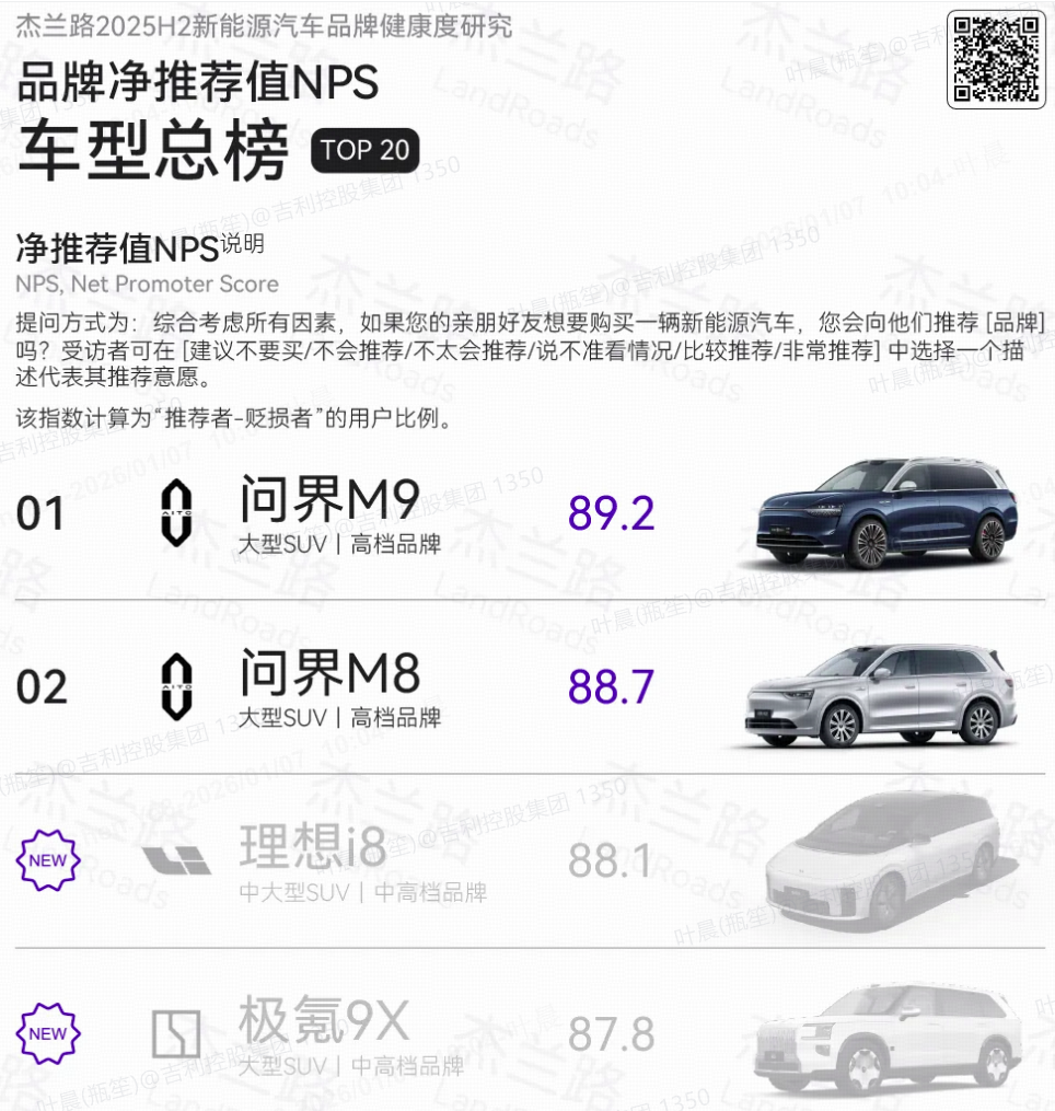 经过一系列举措,极氪“由量到质”“贴近用户”的公关传播策略,重构了中国豪华汽车品牌的信任根基。根据杰兰路《2025年度下半年新能源汽车品牌健康度研究》报告显示,极氪的NPS值在最新评估中快速提升——车型NPS总榜和大型SUVNPS榜单中,品牌旗舰车型极氪9X均位居前列,证明在上市的短周期内消费者便爆发出较强的推荐意愿。