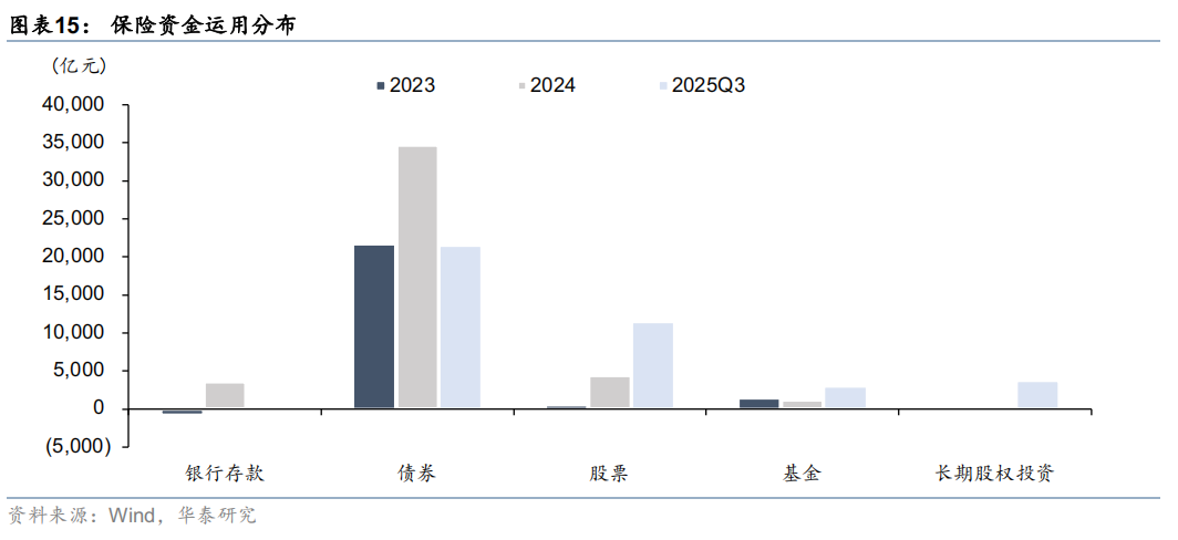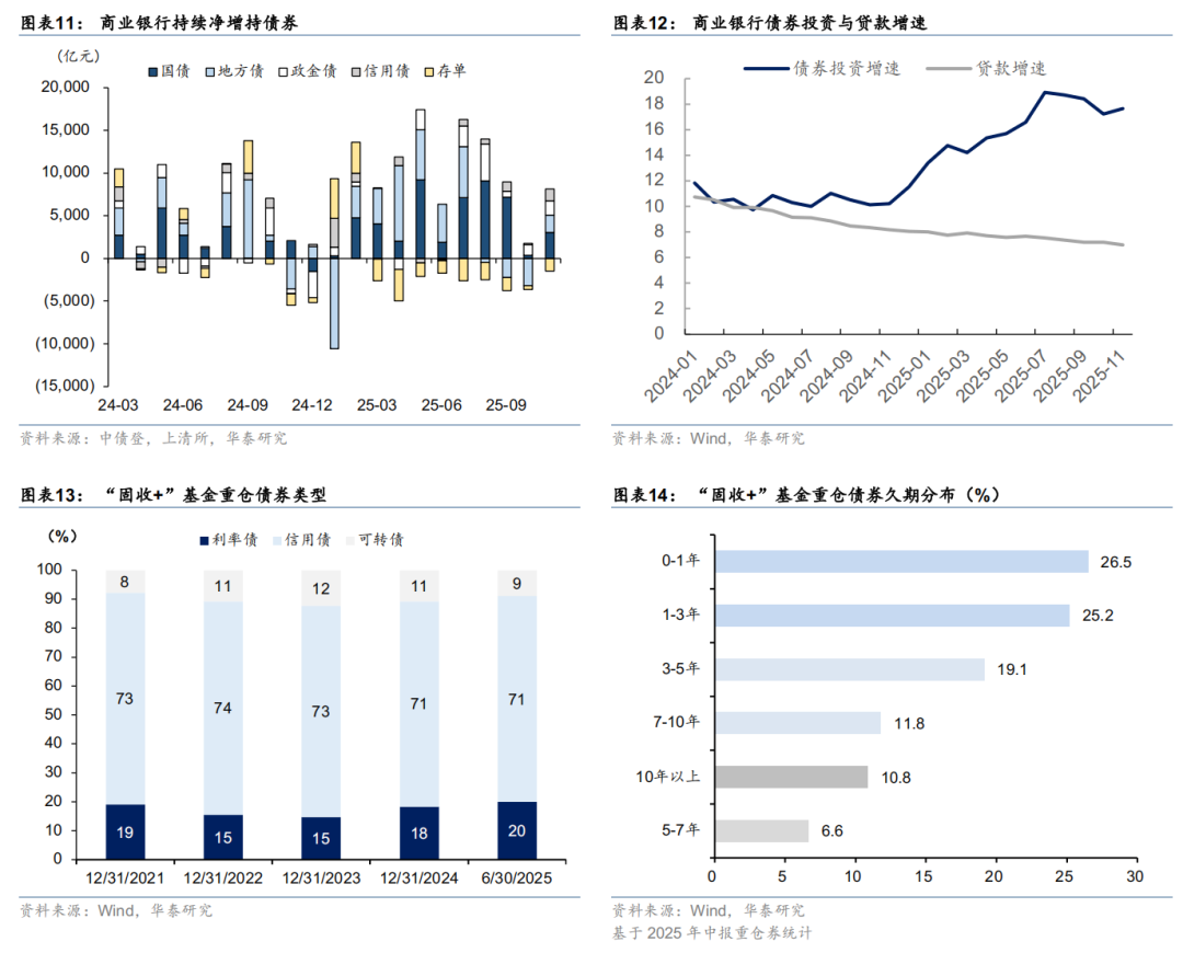我们曾在《股债跷跷板下的机构行为观察》(8月31日)讨论,逻辑推演看,主动缩表—>银行利率债配置减少+存款利率下行+非银规模扩张或再配置压力增大(存款到期)—>更有利于中短端信用债。如果是不缩表—>在融资需求弱的情况下—>供给少+需求强+不能投股票—>债市仍会资产荒。从2025年的银行债券投资及托管数据来看,银行持续净增持债券而非净卖出,且债券投资增速上升,与之对应的银行各项贷款同比增速的持续走低。主要原因在于,尽管银行缩表,但其资产端信贷需求弱化更快更明显,银行仍需买入债券填充资产端,故还无需卖债。不过存款“搬家”过程中,资金从银行流向非银,理财、“固收+”、分红险等膨胀,更确定的是有利于中短端信用债。
