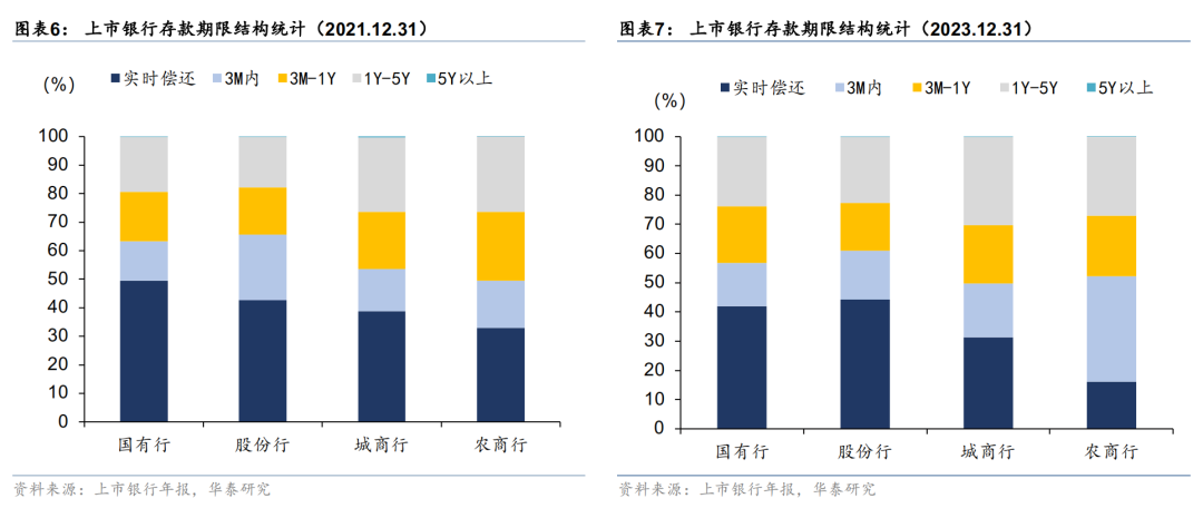 但是2023年之前,银行尤其是国有大行存款成本不降反升,表面看与银行存款利率下调的趋势相悖。一方面反映出银行在扩张资产负债表的过程中,揽储压力仍存(“高息买存款”),不过这在去年央行规范手工补息以及同业存款利率定价、建立存款招投标利率报备机制后有所缓解。另一方面,更深层次的是源于存款定期化和存款期限拉长倾向。过去几年,各类型上市银行定期存款占存款总额的比重呈上升趋势,结构上,“实时偿还”占比下降,1年以上存款占比提升。