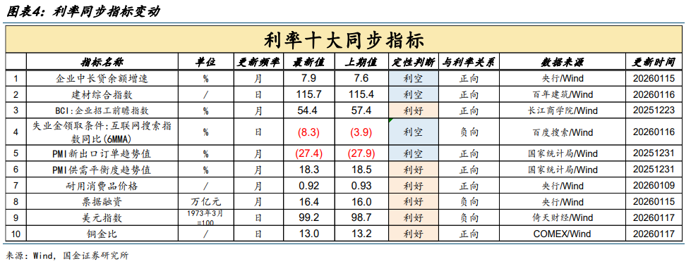 本周(1月11日至1月17日),利率十大同步指标释放的信号以“利好”为主,占比6/10;较上周的变化有:企业中长贷余额增速发出“利空”信号,铜金比发出“利好”信号。