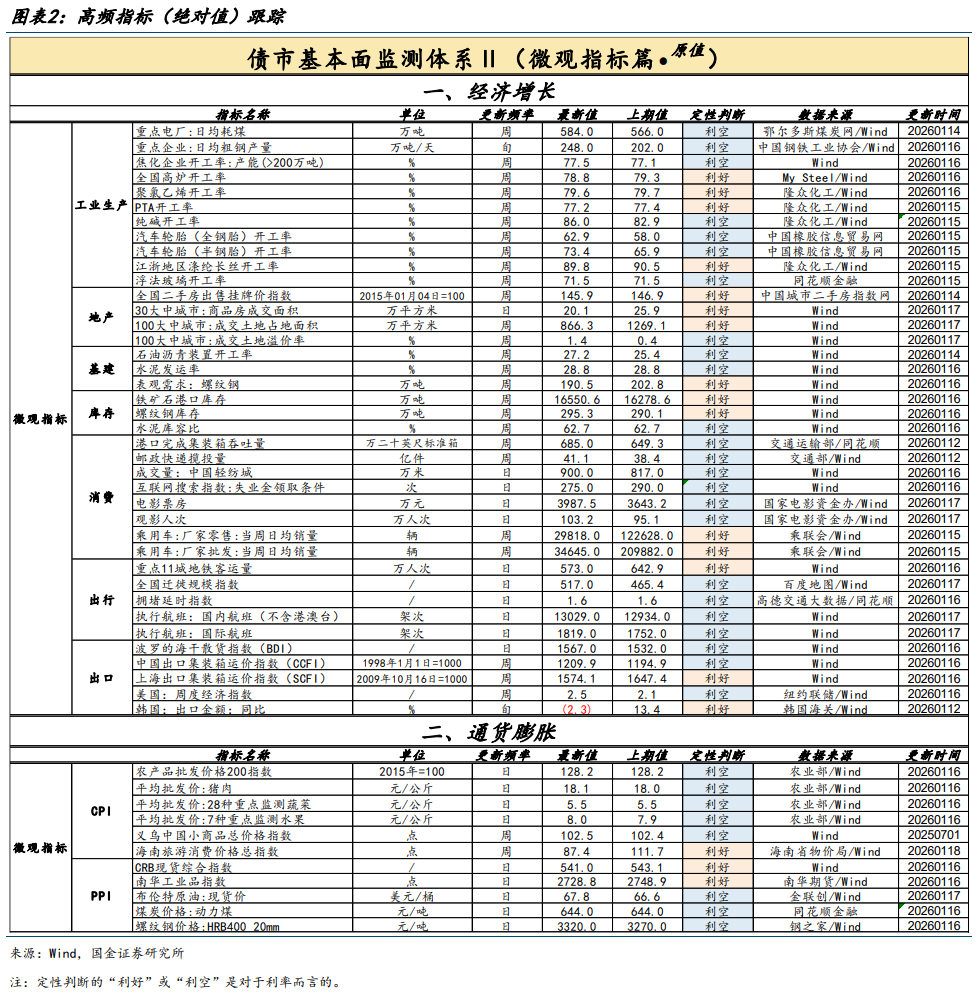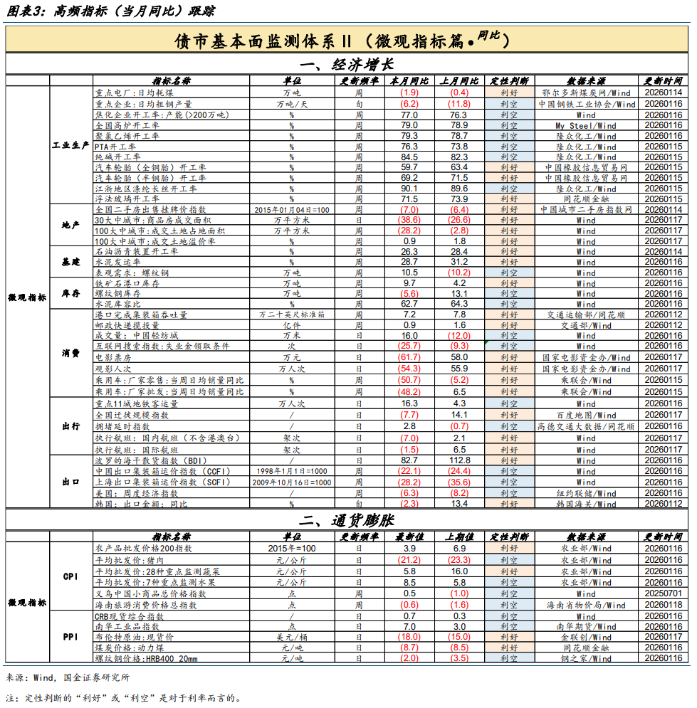 本周(1月11日至1月17日),国金证券固收基本面监测体系中,共有49个高频指标更新。其中我们对绝对值指标计算当月同比,对百分比指标计算月均值,然后针对债市做定性判断。结果显示:总体上,“利好”与“利空”指标个数分别为26个与23个。其中,“利好”主要体现在耗煤、商品房成交量价&土地成交量价、消费(集装箱吞吐量、快递、票房、车市)、出行(远距离)、农产品价格等方面,“利空”主要体现在粗钢产量、多数行业开工率、消费(轻纺成交、失业金搜索指数)、出行(市内)、出口、旅游消费价格、及多数工业品价格等方面。