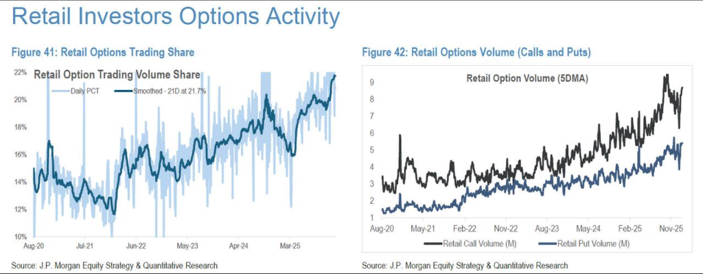 期权市场方面,散户参与度持续处于高位。交易活跃的合约主要集中在特斯拉、英伟达、Meta、AMD、谷歌、美光、微软及苹果等个股,以及SLV和GLD等贵金属ETF。