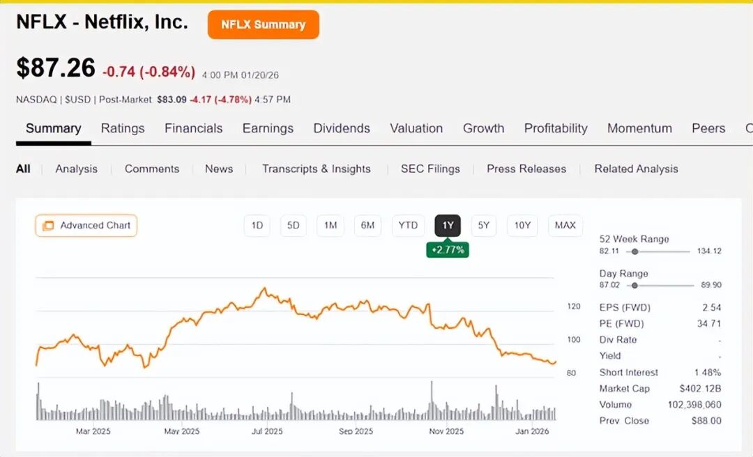 分析师非常看好对华纳兄弟探索频道业务的收购,因为分析师相信,在内容变现方面,它极大地改善了 Netflix 的模式。分析师同样认为,全现金报价是管理层对股价可能继续下跌的一种承认,直到市盈率接近长期增长率。但这意味着股价还有约 50% 的下跌空间。