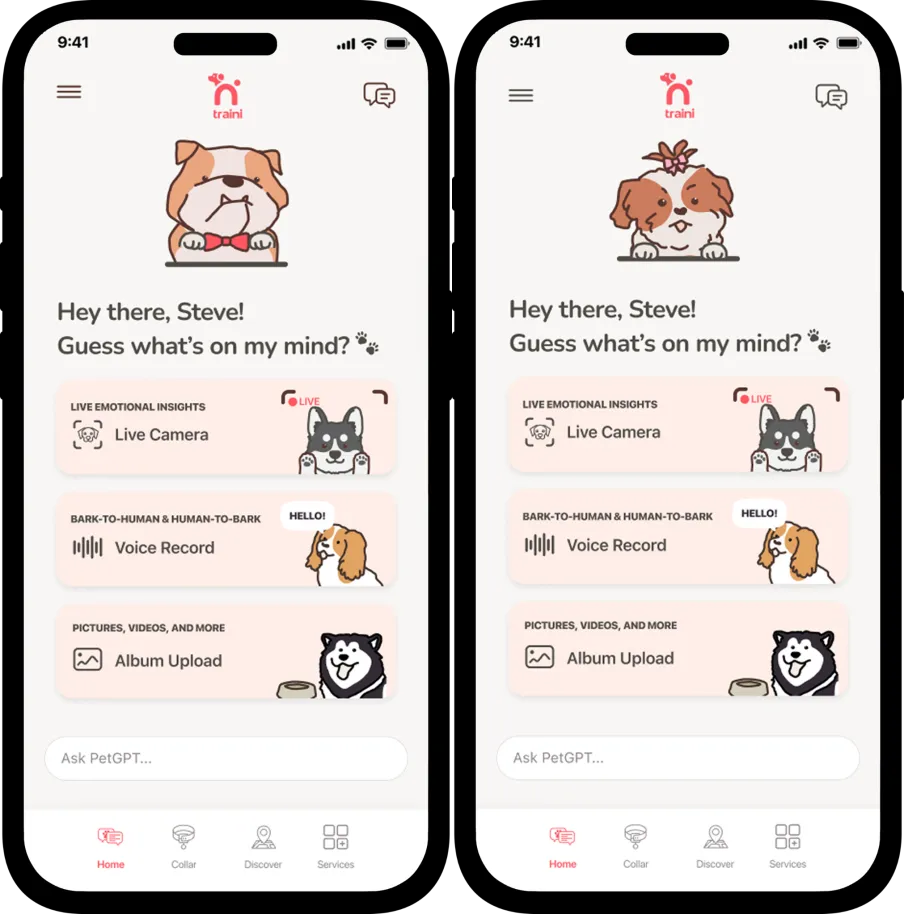 在项圈上市前,Traini App已凭借其犬语翻译功能,流行于养宠人之间。用户只需上传宠物狗的叫声、图片和视频,就能获知狗狗的快乐、恐惧、疑惑等12种情绪,也可以将“看这里”“集中注意力”等18个短句转换成犬吠声。