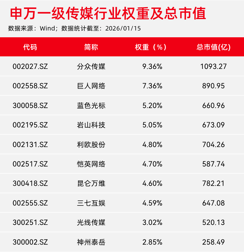 从覆盖这些传媒领域的上市公司中,选取其中总市值较大的50只作为指数样本,编制出中证传媒指数。传媒ETF(512980,联接A/C类004752/004753)跟踪该指数,聚焦传媒行业,其中个股占比又较为分散,前十大权重股合计51.52%,相对分散了集中持股的风险,能够紧跟AI时代传媒业的发展变迁。