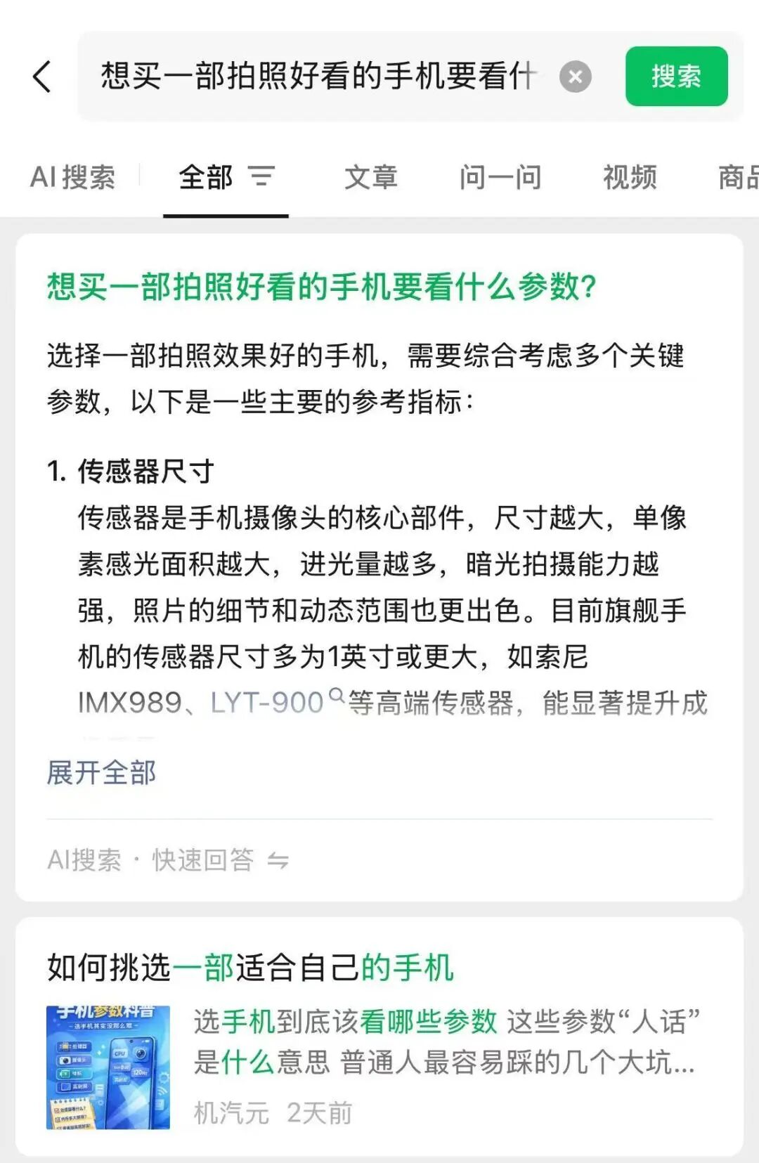 传统搜索引擎面对AI抢流量,也在改变自己,比如用微信搜索功能,排在第一位的也变成了AI生成内容,这和直接用AI聊天区别也不大了——很多人压根不会看下面搜出来的网页。