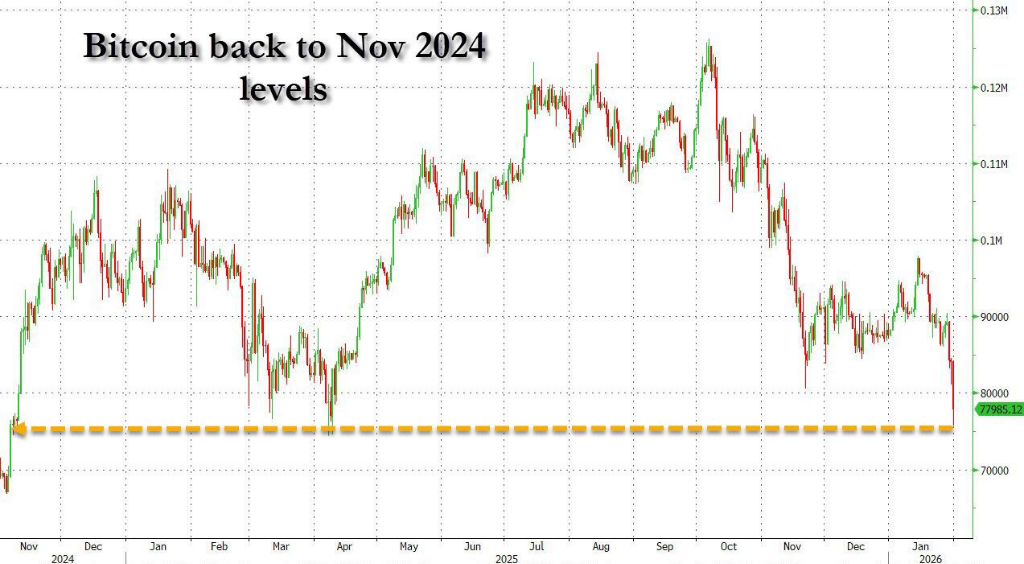 比特币在周五收于83817美元后,到周六晚间已跌至78092美元,跌幅达7%。这一跌势回到了25年4月后的水平,延续了数周来的宏观层面失望。