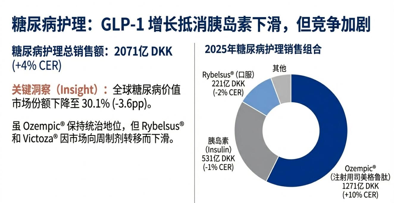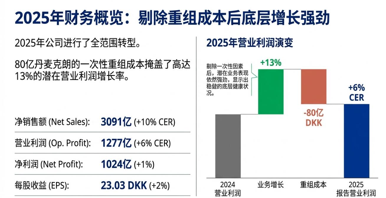 诺和诺德公布的2025年全年业绩显示,销售额增长6%至3090.6亿丹麦克朗,按固定汇率计算增长10%,略高于分析师预期的3076.2亿丹麦克朗。这一增长主要由肥胖护理业务驱动,该业务按恒定汇率计算增长31%,而GLP-1糖尿病产品销售增长6%。