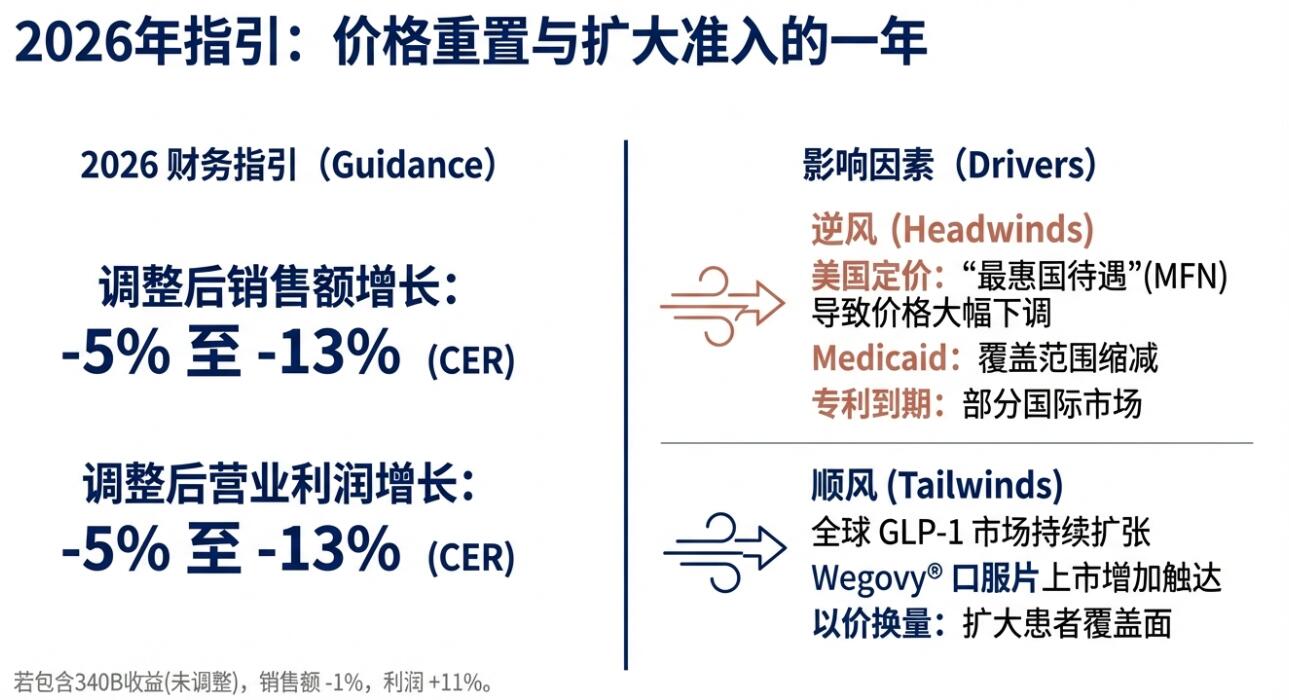 诺和诺德引入了新的非国际财务报告准则(non-IFRS)指标,即调整后销售增长和调整后营业利润增长,以剔除与美国340B药品定价计划相关的42亿美元销售回扣准备金冲回等一次性影响。按非调整基础计算,2026年销售和营业利润增长指引的中点分别为-1%和11%。