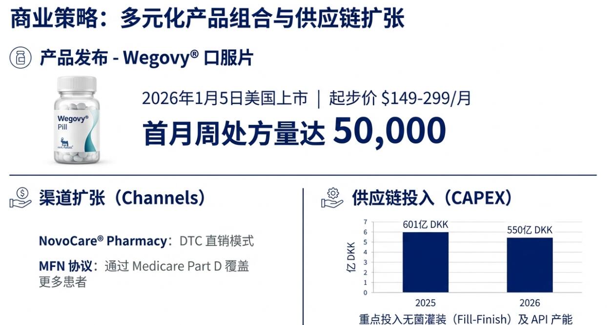 在国际市场,GLP-1治疗的持续渗透和市场扩张将提供增长动力,但竞争加剧和司美格鲁肽化合物专利在某些市场到期的负面影响不容忽视。诺和诺德计划在2026年继续向更多市场推出Wegovy,并在多个国家引入7.2mg剂量。