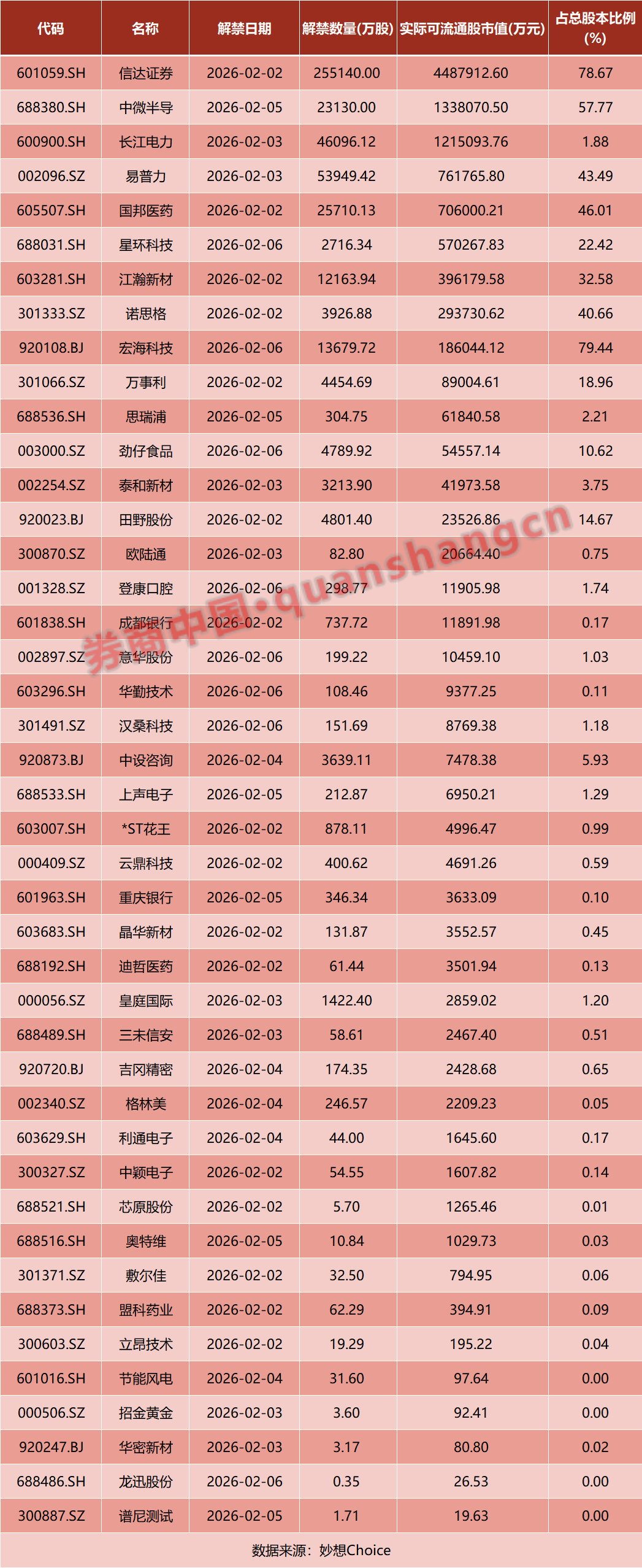 数据显示,本周(2月2日—2月6日)共有43家公司限售股陆续解禁,合计解禁46.35亿股,按最新收盘价计算,解禁总市值为1035.11亿元。