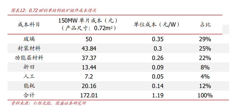 当前钙钛矿单GW产线投资额约10亿元。据国盛证券研究,GW级产线设备投资占比65-70%,约6-7亿元,公辅及动力系统需要投资1.5-2亿元。以150MW级量产线测算,0.72㎡的单结钙钛矿组件成本约1.2元/W,高于当前晶硅水平。