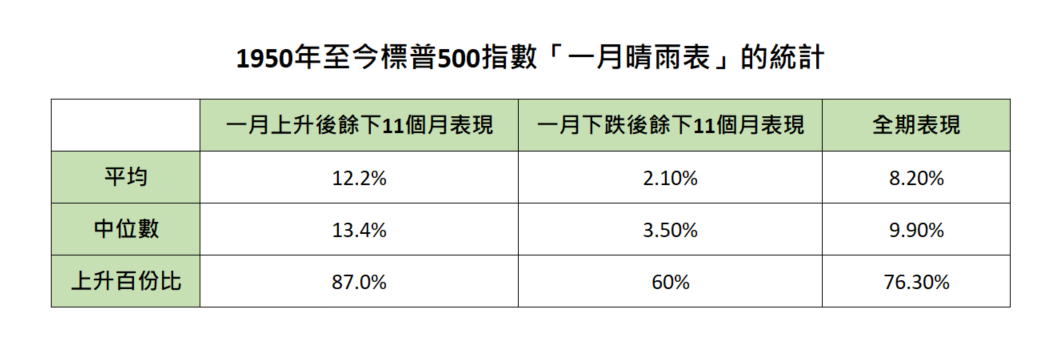 金吾财讯 | 时光飞逝,2026年已踏入第二个月。回顾1月份,标普500指数仍录得约1.4%的温和升幅;然而,步入2月后,市场气氛迅速转弱,短短四个交易日内,标指已累挫约2.0%。不仅完全抵销了上月的升幅,亦令年初至今的表现由升转跌,暂录约0.7%的跌幅,反映短期市场波动明显加剧。话说回来,市场上向来流传一个名为“1月晴雨表”(JanuaryBarometer)的说法,大意是以1月份股市表现,作为预判全年走势的先行指标;简言之,1月收升,全年股市表现大多偏向正面,反之亦然。既然标普500指数在今年1月录得升幅,是否意味全年市况不致过于悲观?从历史数据角度,又是否支持此一观点?根据1950年至今、逾四分之三个世纪的统计,标普500指数于1月份录得升幅的情况,合共出现过46次。观察这46次之中,标指于其后全年余下时间最终仍能录得升幅的,合共有40次,命中率高达87%;其全年平均及中位数升幅,分别为12.2%与13.4%。至于1月份录得下跌的年份,则合共出现30次,但其后全年余下时间最终录得跌幅的比例,仅约四成;换言之,即使“1月报跌”,全年市况亦未必转为熊市,其平均及中位数表现,仍分别录得约2.1%及3.5%的升幅,只是升势相对温和而已(附表)。综合而言,从长期统计角度观察,“1月晴雨表”确实具备一定参考价值,尤其对于1月上升年份,其对全年走势的预示能力相当显着;惟其预测力亦非百分百准确,特别是在1月下跌时,对全年市况的指引相对有限。无论如何,监于今年1月标普500指数录得升幅,按历史经验推算,标指在今年余下时间、并于年底录得正回报的机会仍然偏高。当然,这并不意味美股短期内不会出现进一步调整,投资者仍需留意市场波动与风险管理。附表: