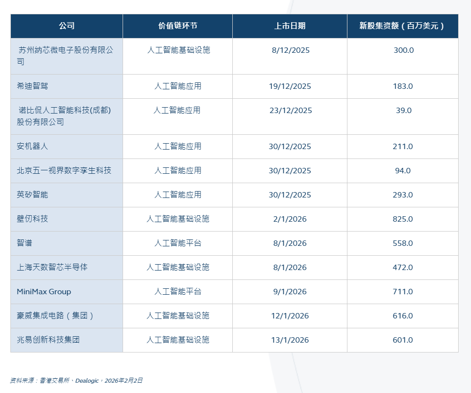 香港交易所分别于1月8日及9月迎来 “中国AI六小虎” 当中的Minimax及智谱上市,是首批来港上市的中国内地生成式人工智能平台。去年12月和今年1月共有十二家人工智能价值链(包括人工智能应用及人工智能基础设施)公司在港上市。