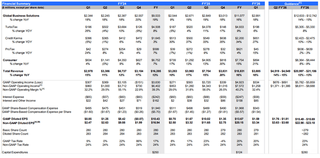 2025 财年,TurboTax 与 Credit Karma 增长提速,ProTax 有所放缓,Global Business Solutions 保持稳定。2026 财年指引显示,GBS、TurboTax、ProTax 增速略有放缓,Credit Karma 放缓幅度更大,但早期数据已超预期。