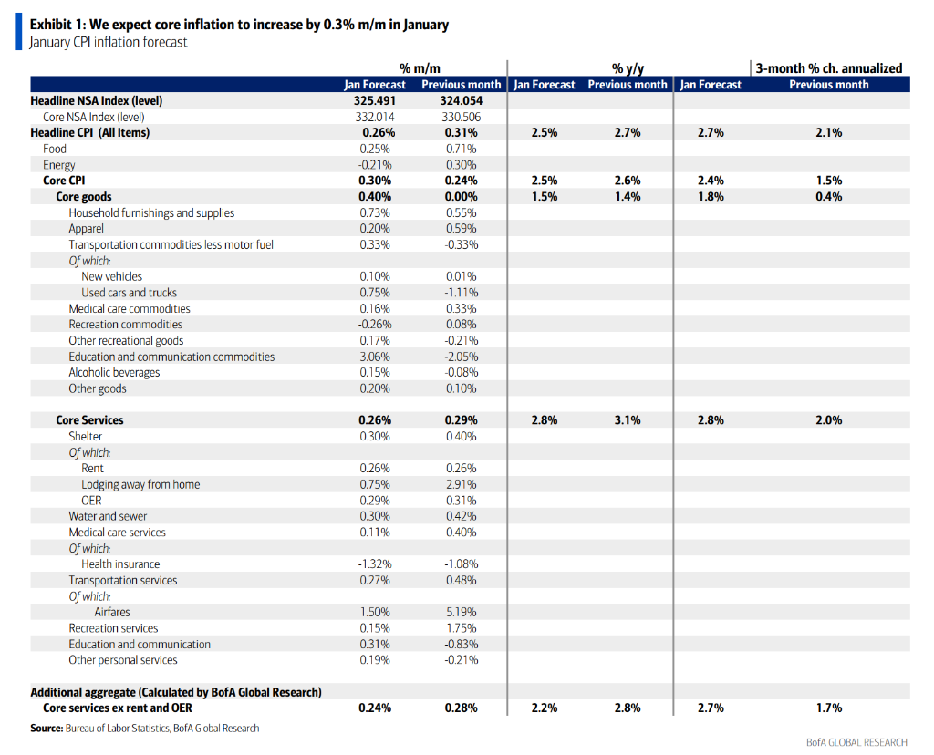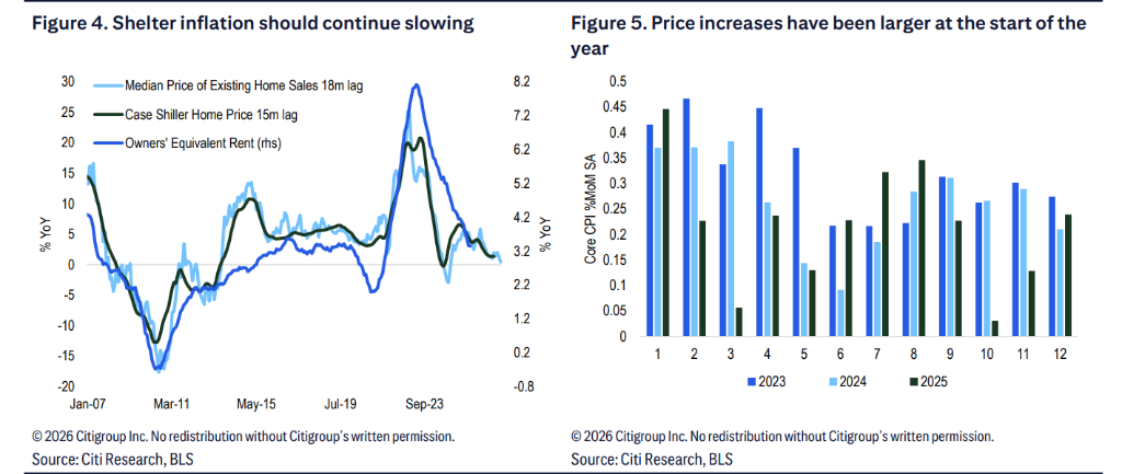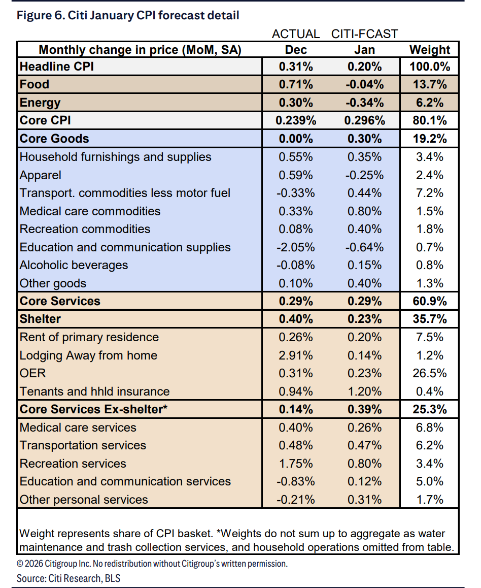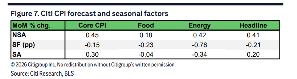花旗认为,1月数据的关键在于服务业价格的持续强度。该机构预计,核心服务业(不含住房)价格环比将上涨0.39%,这一涨幅虽不低,但显著低于过去两年1月约0.7%的水平。花旗强调,如果服务业价格的残留季节性涨幅弱于往年,将证明潜在通胀压力已放缓。