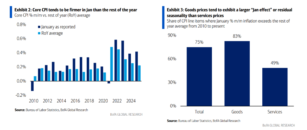 此次数据的焦点在于商品价格与服务业通胀的背离。一方面,关税成本的转嫁正在推高商品价格;另一方面,服务业价格的季节性强度成为判断通胀粘性的关键。美银认为,关税传导叠加“一月效应”将支撑更高的通胀读数。然而,花旗指出,若服务业价格的季节性涨幅弱于往年,将为美联储鹰派官员提供潜在通胀压力减缓的有力证据。