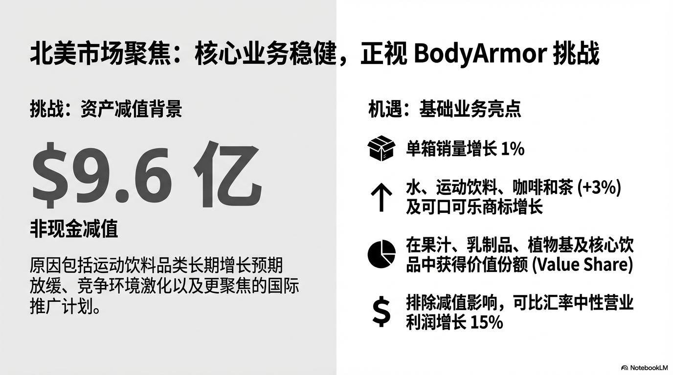 尽管营收端表现尚可,但北美市场的利润端却遭遇了“黑天鹅”。财报显示,四季度北美地区营业利润同比暴跌65%,主要原因是计提了与BodyArmor商标相关的9.6亿美元非现金减值费用。
