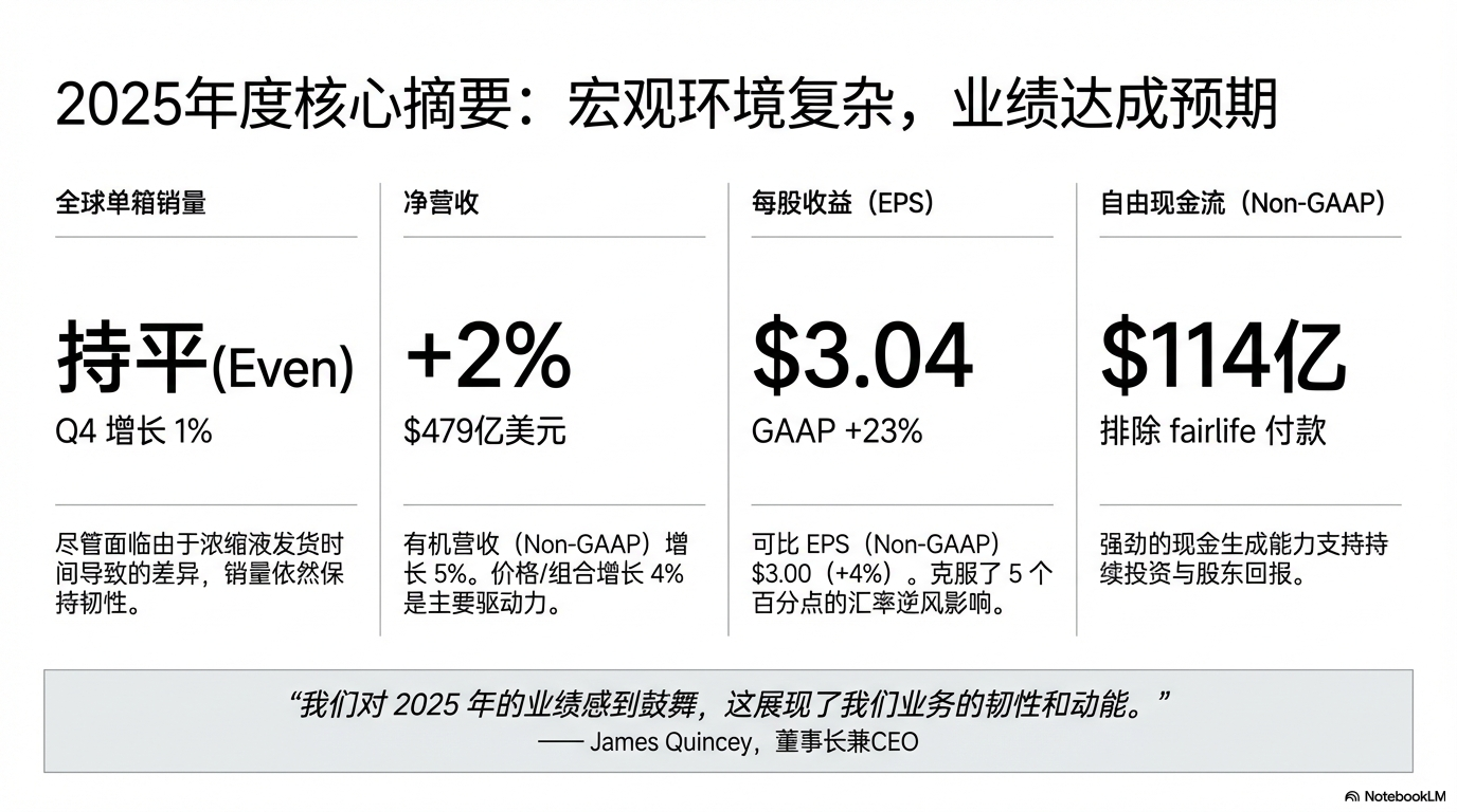 尽管零糖系列表现依旧亮眼,且四季度业绩略超预期,但在通胀降温、定价权红利消退的背景下,可口可乐给出的2026年增长指引略显疲态,令市场感到失望。