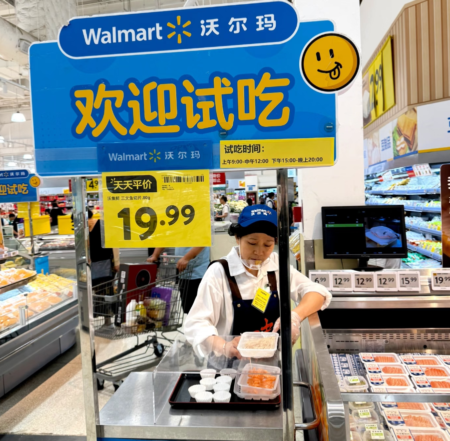 就连山姆的试吃文化,也被搬到了沃尔玛,门店里的试吃档口从早到晚不歇业,烘焙、零食、生鲜的试吃,让消费者“先尝后买”,这也是山姆的经典玩法。