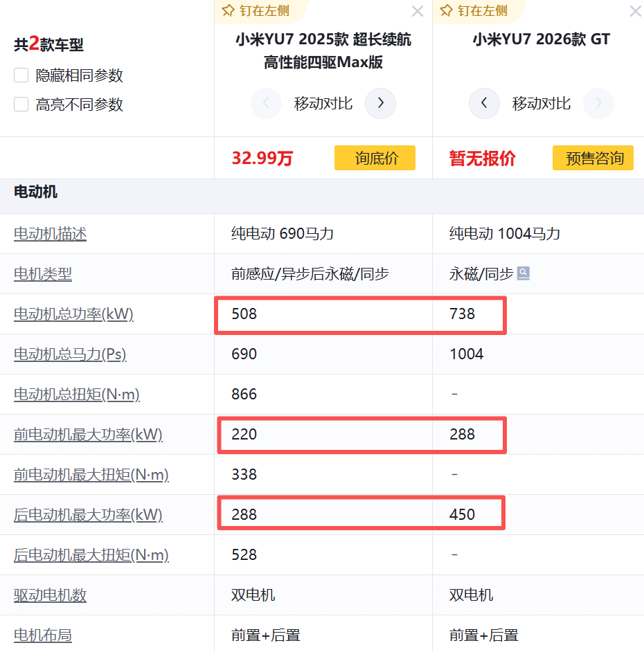 同样是双电机四驱,YU7 GT 的功率会比 YU7 Max 高将近 300 匹左右。