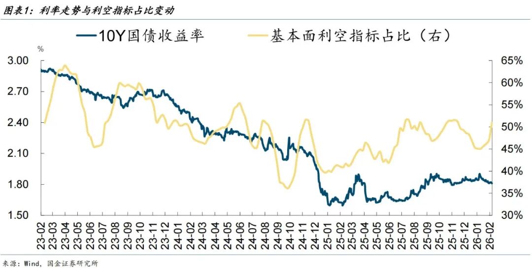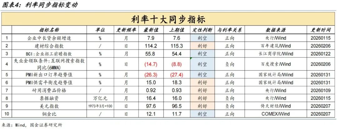 本周(2月1日至2月7日),利率十大同步指标释放的信号中,“利好”和“利空”各自占比5/10;较上周的变化有:美元指数发出“利好”信号,铜金比发出“利空”信号。