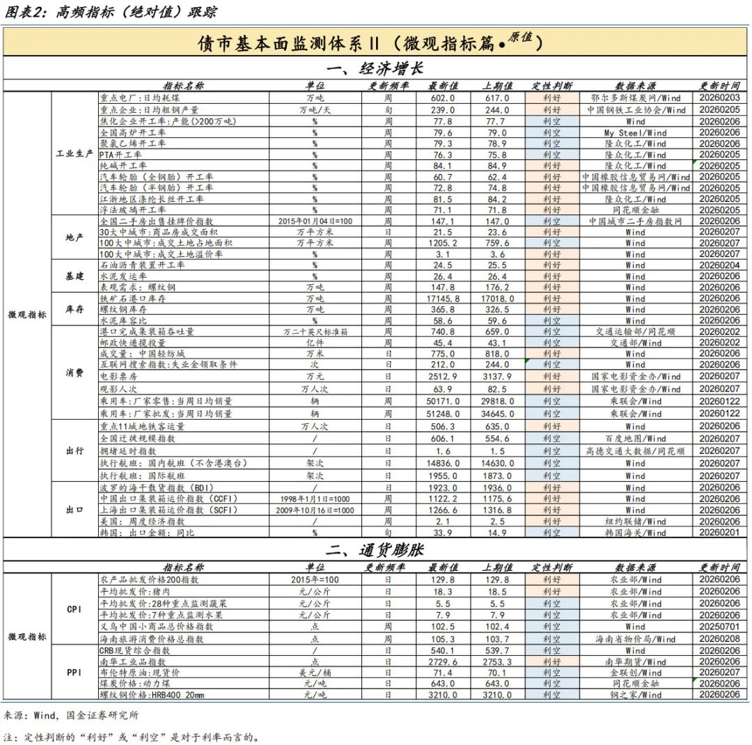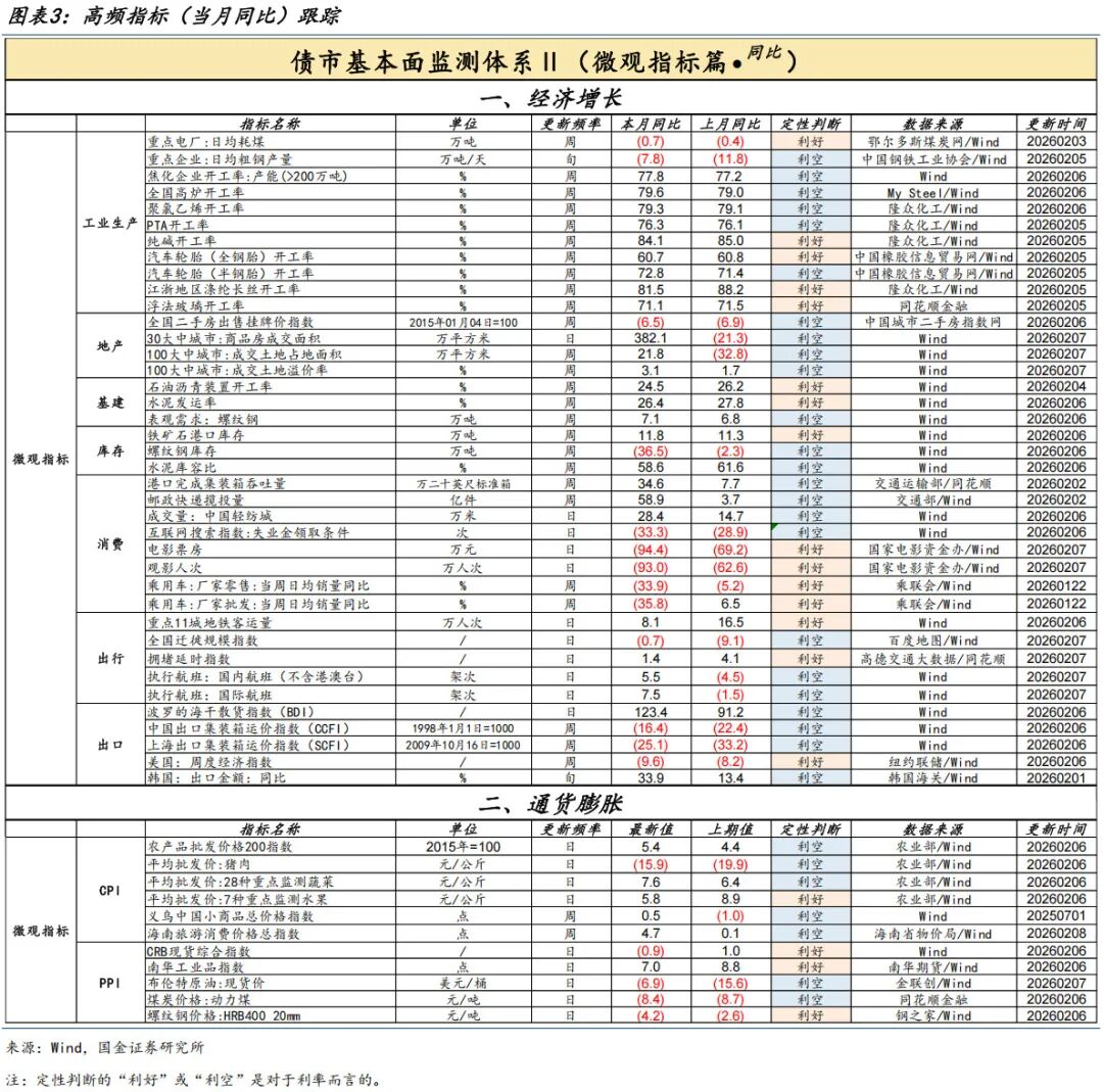 本周(2月1日至2月7日),国金证券固收基本面监测体系中,共有47个高频指标更新。其中我们对绝对值指标计算当月同比,对百分比指标计算月均值,然后针对债市做定性判断。结果显示:总体上,“利好”与“利空”指标个数分别为17个与30个。其中,“利好”主要体现在耗煤、消费(票房、车市)、出行(市内)、工业品价格等方面,“利空”主要体现在粗钢产量、多数行业开工率、商品房成交量价&土地成交量价、消费(集装箱吞吐量、快递、轻纺成交、失业金搜索指数)、出行(远距离)、出口、旅游消费价格、及多数农产品价格等方面。