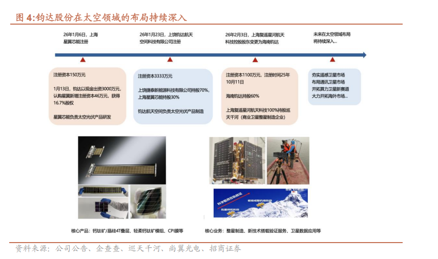 金吾财讯 | 2月8日,招商证券发布研报指出,上海复遥星河航天科技有限公司发生工商变更,钧达股份(002865.SZ/02865.HK)以60%持股比例成为其控股股东,而复遥星河航天科技100%持股商业卫星公司巡天千河,这意味着钧达股份正式实现对巡天千河的间接控股。作为国内知名的卫星整星公司,巡天千河的核心竞争力成为钧达股份此次布局的重要价值锚点。研报显示,巡天千河技术团队源于航天科技集团,拥有近百颗商业卫星研制经验,团队配置堪称行业顶尖,包含6名博士、11名硕士,平均年龄35岁以下,全部核心分系统负责人,均由核心院所主任/副主任设计师担任。在技术与产能层面,该公司掌握卫星核心单机、有效载荷核心技术,供应链自研比例约70%,可提供卫星研制、新技术搭载验证、用户终端研制等一体化解决方案,整星制造能力覆盖10kg至1000kg各类卫星,应用领域涵盖通信、遥感、态势感知、AI算力等多领域。从商业化进展来看,巡天千河已形成成熟的项目落地能力,2024年以来已成功发射近10颗卫星,同时承接了近30余颗商业卫星研制任务,其新体制光学遥感一体化卫星研制水平达国际一流,微波气象载荷平台一体化卫星技术更是处于国内领先地位,是国内稀缺的同时具备被动微波载荷、物联网载荷、光学感知载荷能力的企业,具备平台一体化柔性定制化批产能力,为后续业务拓展奠定了坚实基础。据悉,目前巡天千河研发总部已迁至上海松江,恰逢上海全力打造商业航天产业集群并出台多项扶持政策,包括项目固定资产投资补贴、卫星发射与保险补贴、航天器入轨运营奖励等,巡天千河有望直接享受产业与政策红利。研报同时披露,巡天千河已制定四大发展战略,将持续夯实遥感卫星市场、布局通讯卫星市场、开拓算力卫星新赛道,并大力拓展海外市场。此次控股并非钧达股份的孤立布局,而是其太空领域战略的重要一环,且与公司现有业务形成深度协同。研报指出,钧达股份作为首家A+H上市光伏主产业链公司,资本实力雄厚且拥有灵活的激励机制,能为巡天千河提供充足财力保障;更关键的是,钧达股份在CPI膜、钙钛矿&晶硅领域有望与巡天千河的卫星业务形成天然适配,其太空能源产品可直接对接巡天千河的卫星能源需求,实现技术与应用场景的闭环。2026年1月,公司与尚翼光电/上海光机所深度合作,不仅持有尚翼光电团队创始人及创始股东新设的项目公司星翼芯能16.67%的股份,成为其第二大股东,还与其成立了钧达航天空间科技(均达持股70%,星翼芯能持股30%),专门负责CPI膜和钙钛矿叠层产品的产业化。该合资公司在太空能源应用领域有较深积累,有望快速进入国内外大客户体系。招商证券认为,此次控股巡天千河,让钧达股份实现了“太空能源(钙钛矿晶硅叠层、CPI膜)+卫星整星制造”的产业链布局,形成技术研发、产品制造、场景应用的闭环,两大业务板块将形成协同共振,核心竞争力进一步凸显。2026年2月2日,钧达股份还完成了H股配售,募资净额约4亿港元,将重点投入商业航天相关领域。整体来看,钧达股份此前成功卡位太空光伏赛道,此次控股巡天千河又让其进一步切入卫星领域,商业航天技术和A+H双平台的资本优势结合,有望推动公司实现跨越式发展。(本文数据均来自招商证券研报,不构成任何投资建议)