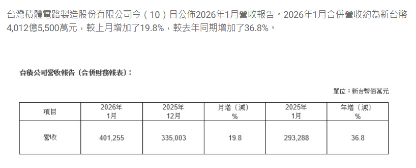 2月10日,台积电官网显示,台积电1月销售额达到4012.6亿元台币,同比增长36.8%,较2025年12月环比增长19.8%,超过台积电预期的全年30%增长水平。不过,去年同期的对比基数可能受到农历新年假期影响,2025年春节假期落在1月份。