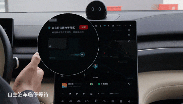 “大家看,前面的车正在排队,我们的车自己就会在旁边等一等,这个挺神奇的。而且有了领航换电功能,换电一刻都不用下车。”李斌指着身后。