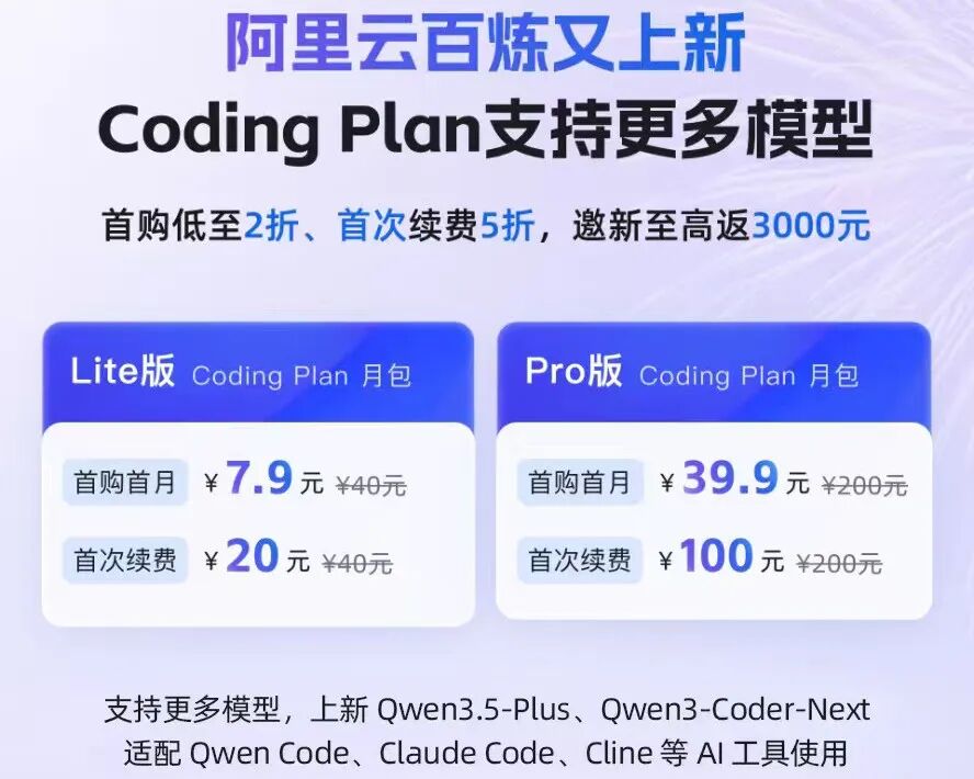 ( 差评 ) 2 月 22 日,阿里云 Coding Plan 订阅服务新增支持 Qwen3.5-Plus、Qwen3-Coder-Next、GLM-4.7、Kimi-K2.5 共 4 款顶尖编程模型。