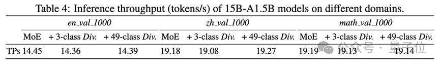 不仅效果好,还省资源值得一提的是,LED计算非常轻量级,仅涉及Router输出的低维向量运算。实验数据显示,相比标准MoE,新方法的训练吞吐量几乎没有下降(TPS保持一致),且额外推理成本为零。