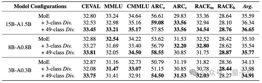 全面超越基线在MMLU、C-Eval、CMMLU、ARC等7个主流基准测试中,搭载了专家分化学习的模型全面超越了标准MoE基线。特别是在15B模型上,细粒度策略带来的平均分提升超过1个百分点——在预训练领域,这通常意味着数百亿Token的训练差距。