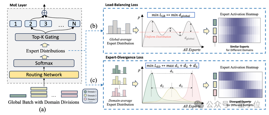 为了解决这一顽疾,来自阿里巴巴集团的研究团队提出了一种全新的专家分化学习(Expert Divergence Learning)策略。他们利用预训练数据中天然存在的“领域标签”,设计了一种新的辅助损失函数,鼓励不同领域的Token在路由统计信息上表现出差异,从而引导专家分化出真正的专业能力。
