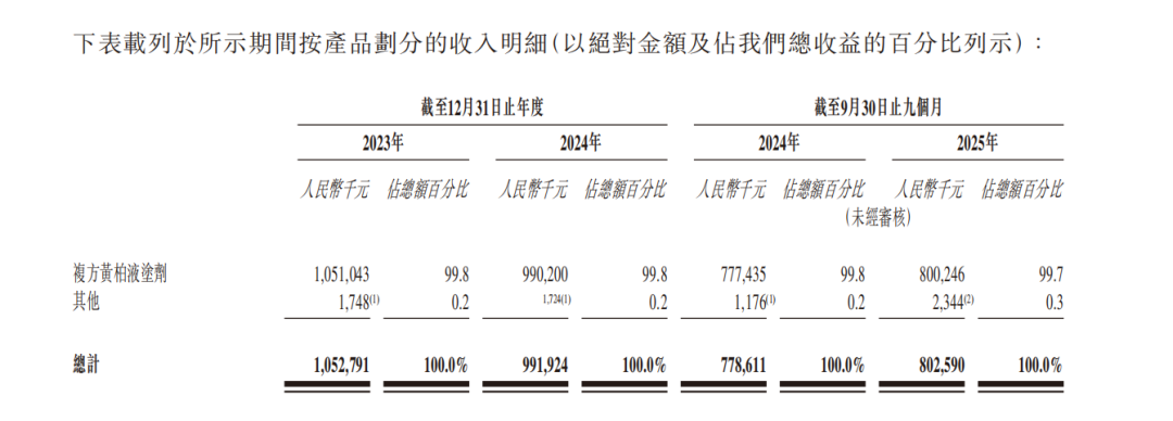拥有技术和政策保护双重壁垒优势,复方黄柏液涂剂成为公司名副其实的“基本盘”。据招股书,2023年至2024年及2025年前9个月,公司营业收入分别录得约10.53亿元、9.92亿元及8.03亿元,年(期)内利润分别约2.37亿元、1.99亿元和1.45亿元。