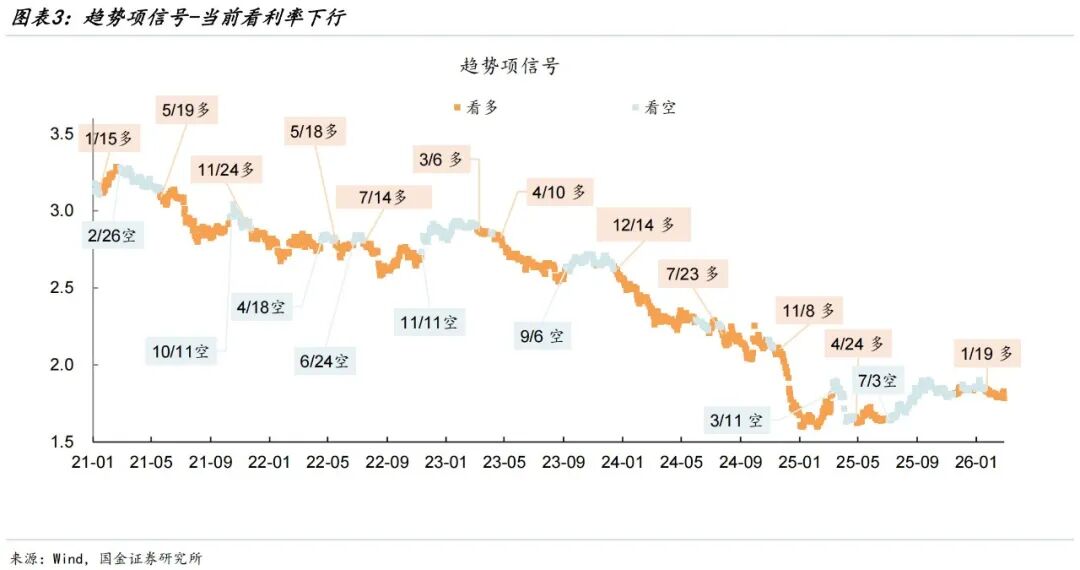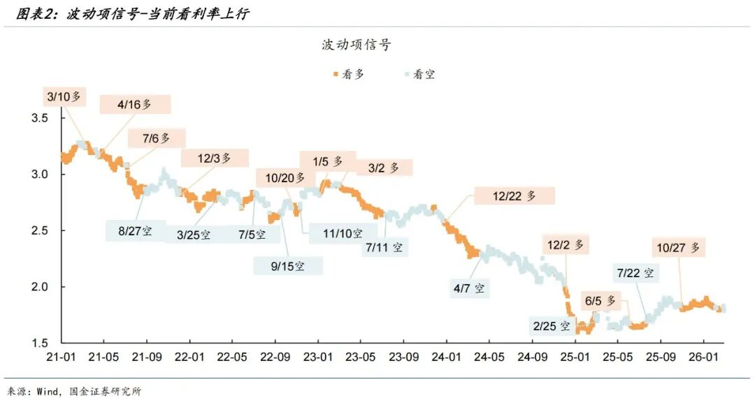 2026年:年初至1月18日,模型总信号延续去年12月末的看震荡信号,趋势看空、波动指标看多;而后1月19日,趋势指标转为看多,2月3日波动信号转空,2月9日波动信号恢复看多,2月25日波动信号转为看空,当前模型总信号看利率震荡。