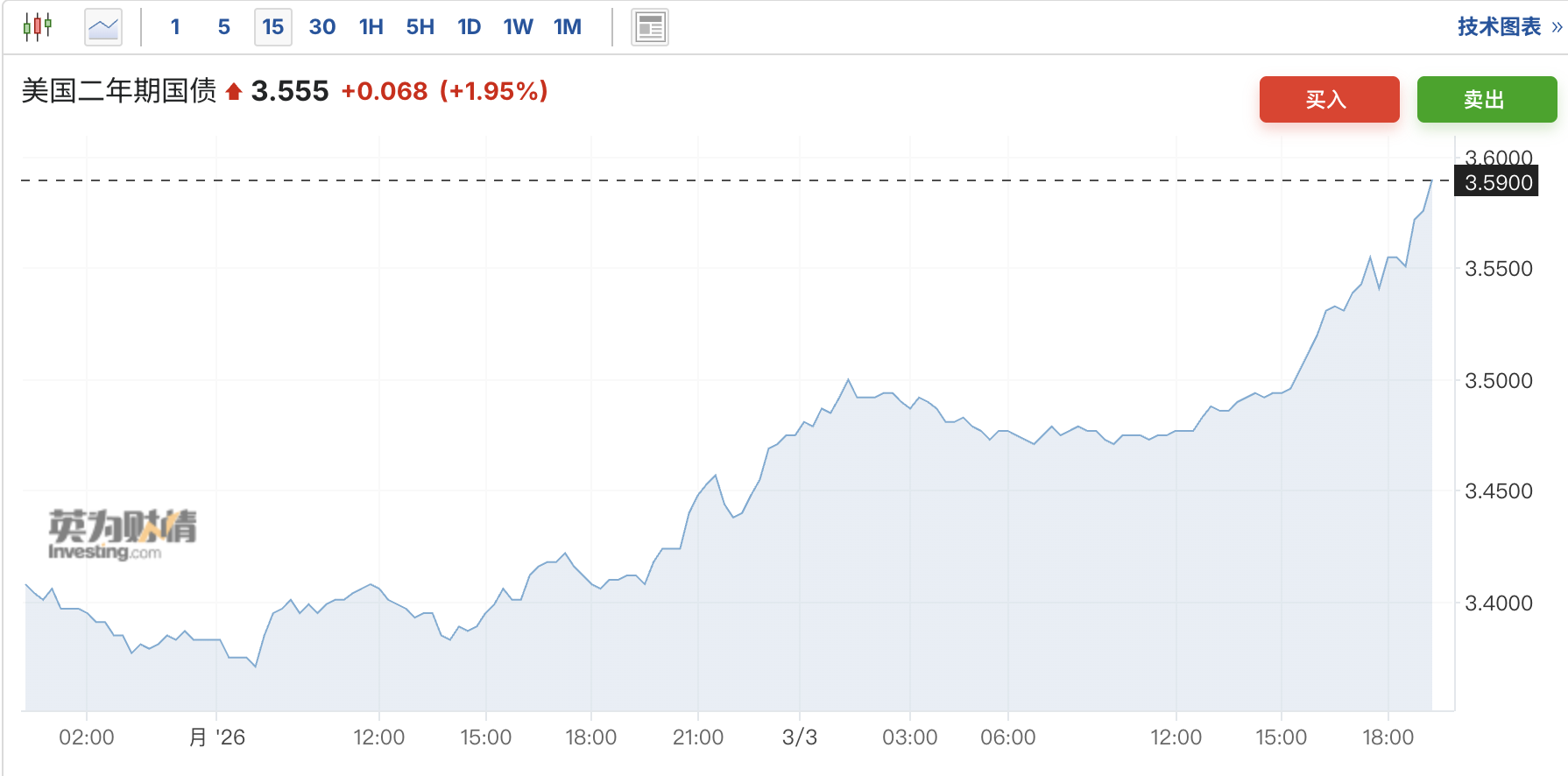 预期的大幅反转推动美国短期国债快速下跌,两年期国债收益率一度跃升12个基点至3.59%。
