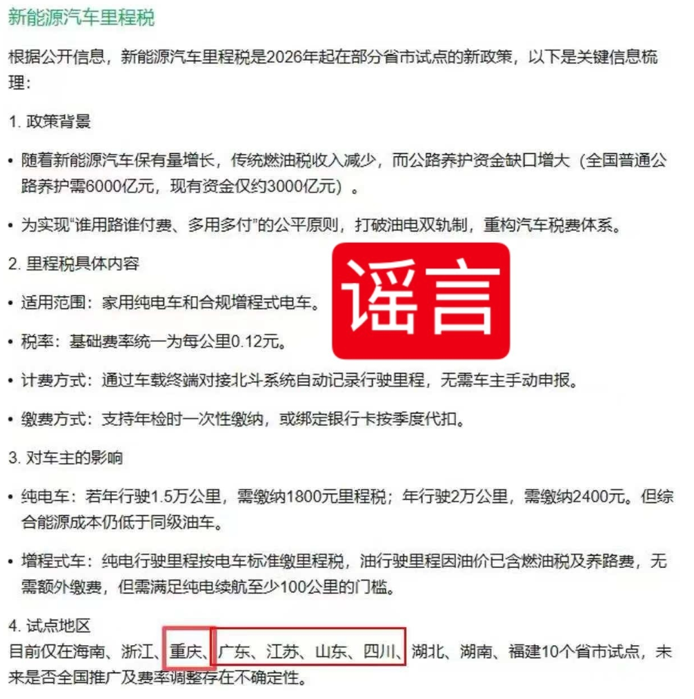 ( 观察者网 )近期,“ 国内 10 省市自 2026 年 1 月 1 日起试点开征新能源汽车里程税 ”相关信息在社交平台发酵,传言明确列出试点地区、收费标准与代扣方式,引发车主与购车人群高度关注。